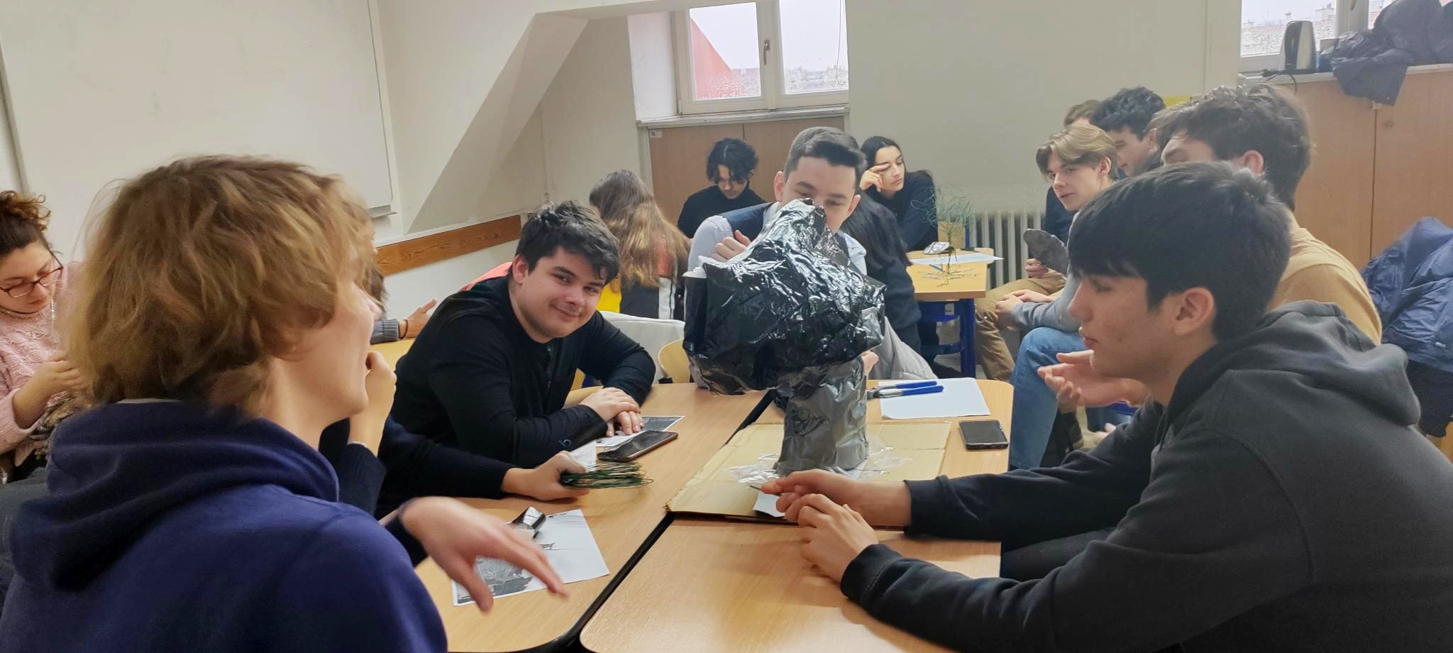 Po promítání už jsme toho věděli dost na to, abychom mohli začít se skupinovou prací. Proto jsme se do toho v úterý ráno pod vedením paní profesorky Svatošové vrhli. Zadání bylo těžší, než se zdálo: navrhnout a vyrobit sochu, která by měla stát na místě Stalina, a napsat k tomu nějaký příběh nebo básničku zdůrazňující proč je důležitá a co symbolizuje. K dispozici jsme měli drát, igelit a lepenku. Vznikla tři velice originální a zajímavá díla, která jsme poté ve středu ráno prezentovali.