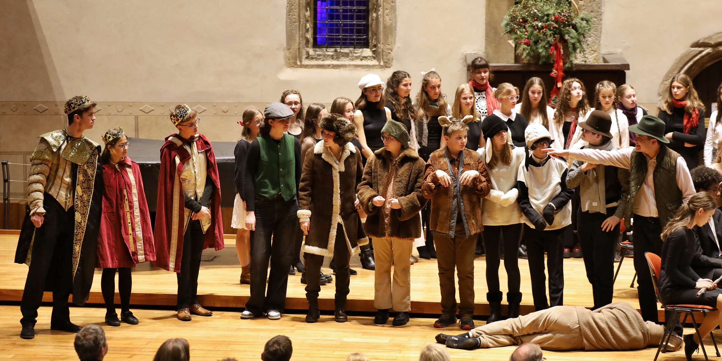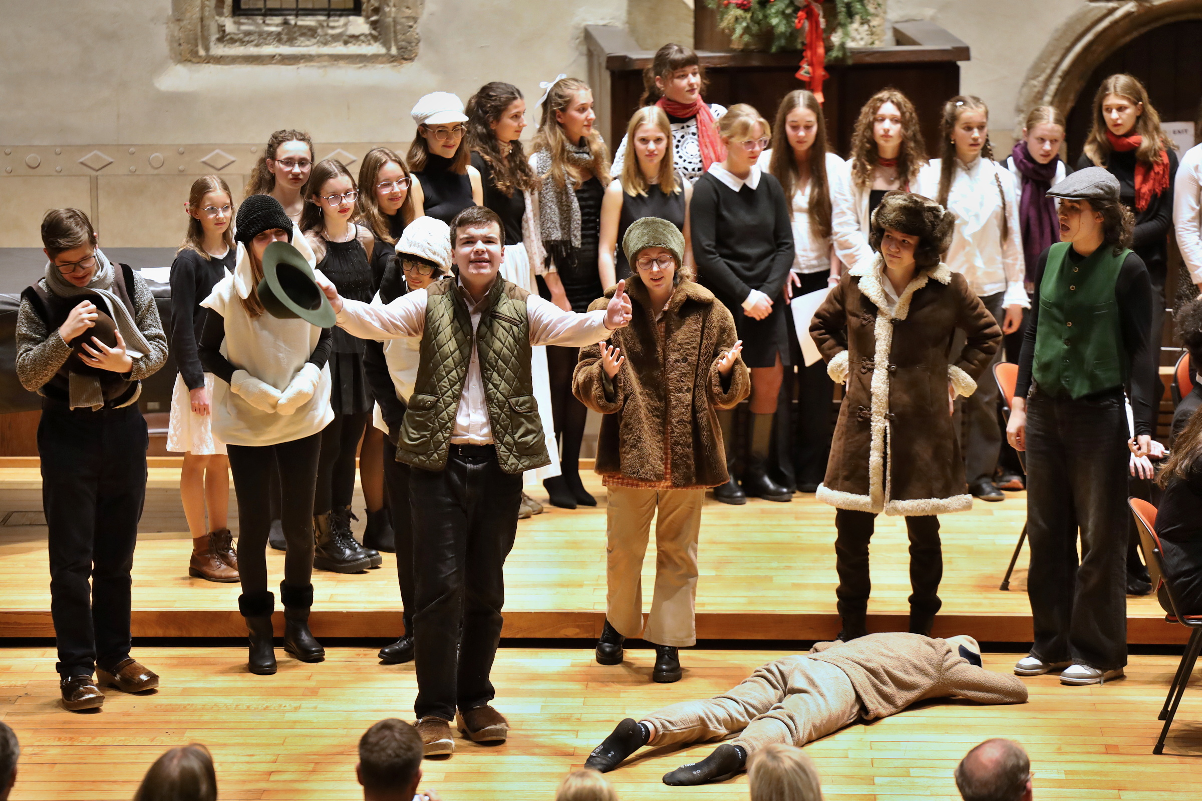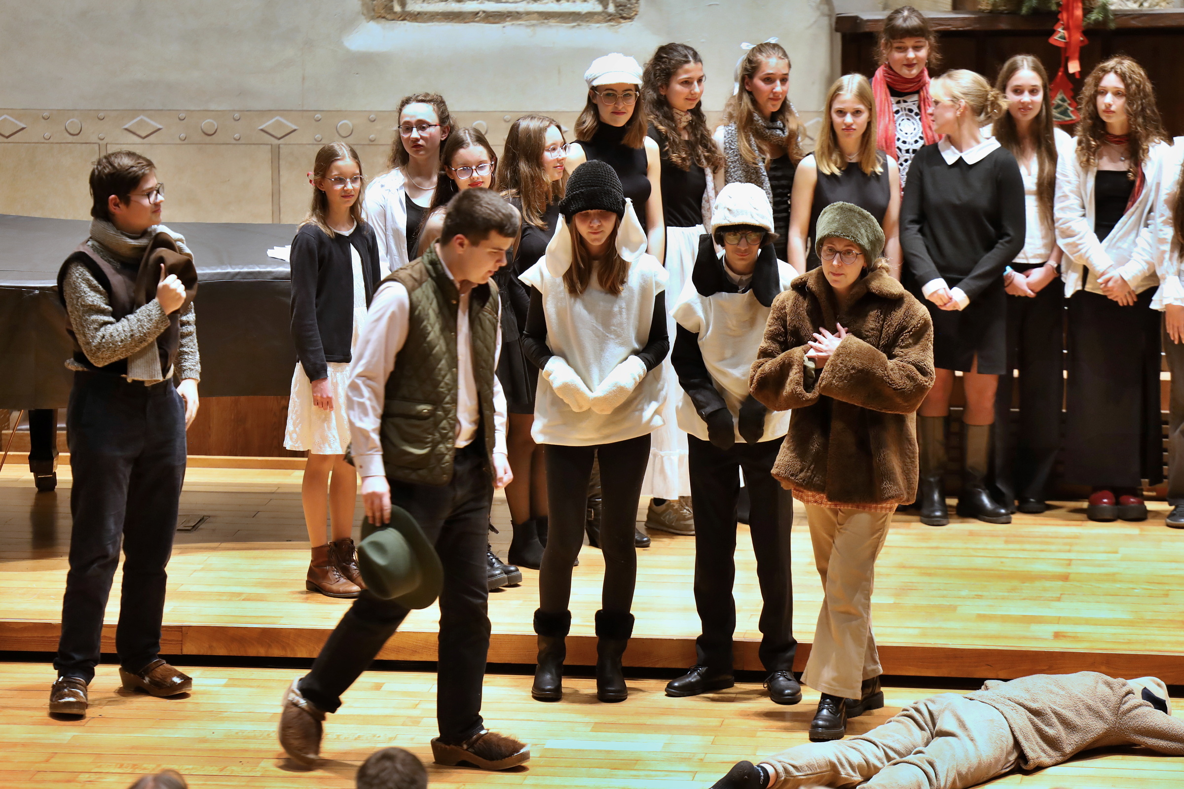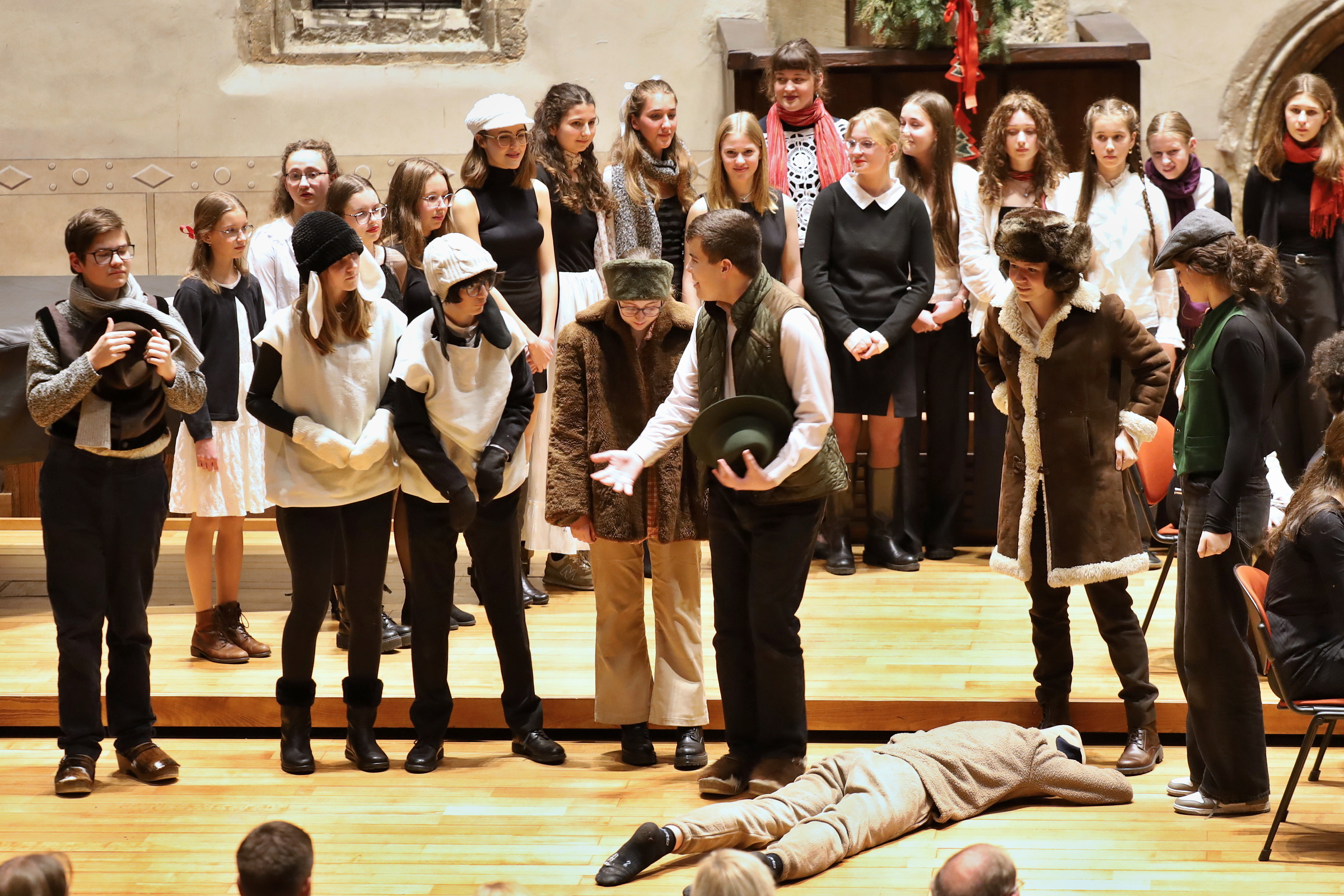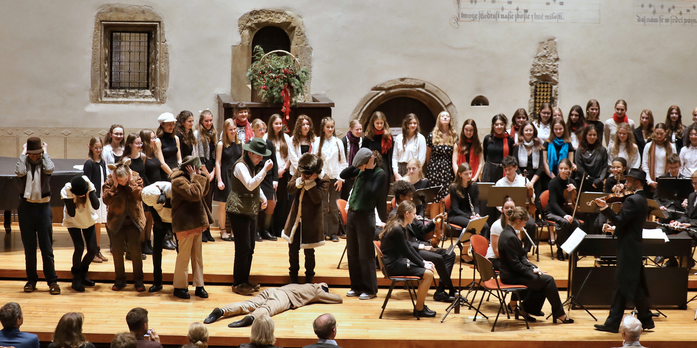 Díky ochotníkům z Vánočního divadelního souboru, Příležitostného vánočního sboru a Komorního orchestru GJN jsme 9. 12. 2025 opět naplnili Betlémskou kapli a dopřáli si nádherný adventní zážitek. Děkujeme prof. Vítu Kubánkovi za neutuchající úsilí ve vedení sboru a orchestru, prof. Filipu H. Hrtelovi a paní ředitelce Zuzaně Wienerové za režii Rakovnické vánoční hry a samozřejmě všem studentkám a studentům, kteří tuto nádheru nazkoušeli. A těšíme se na malou ozvěnu v podobě pátečního zpívání na schodech.