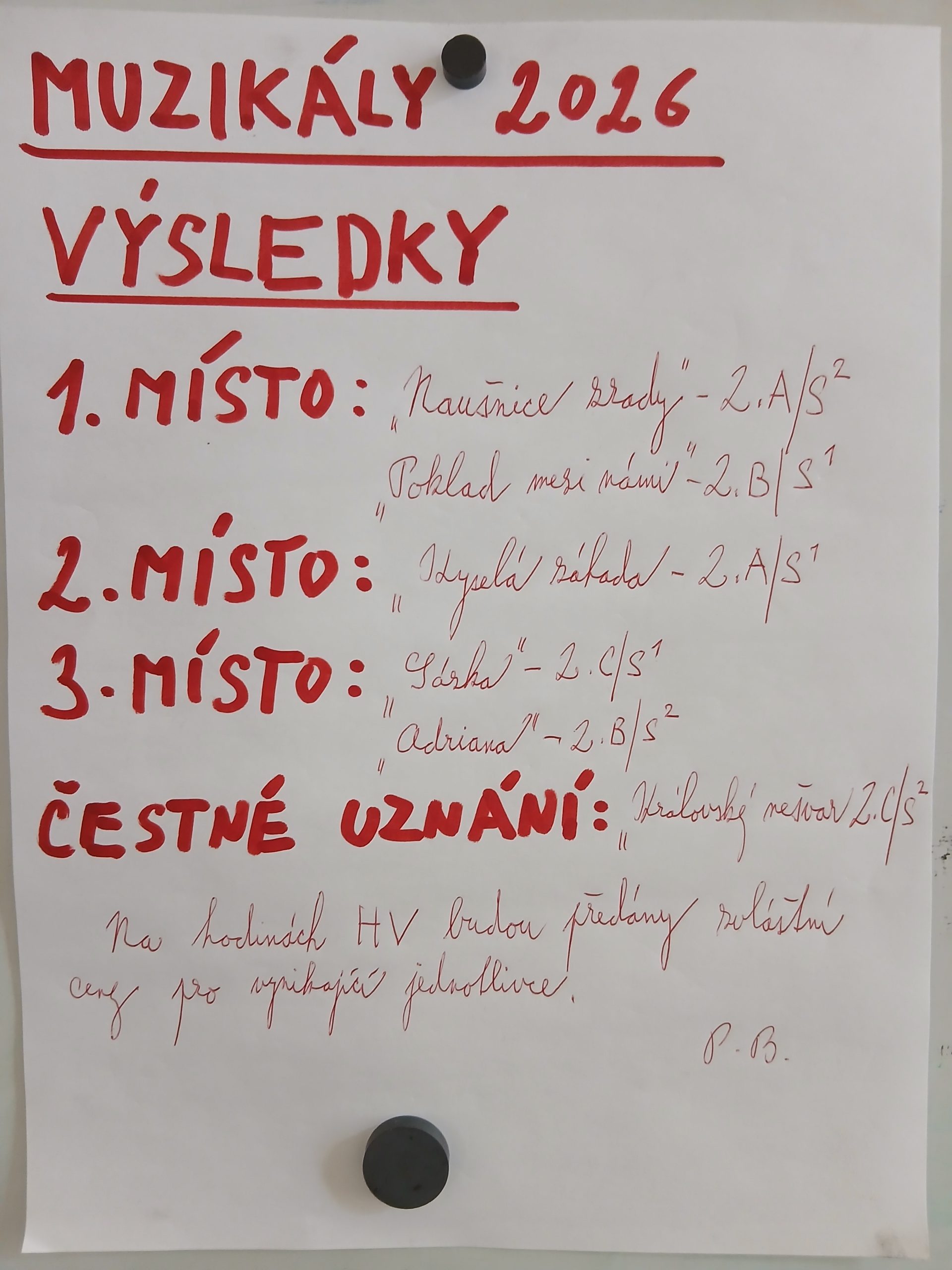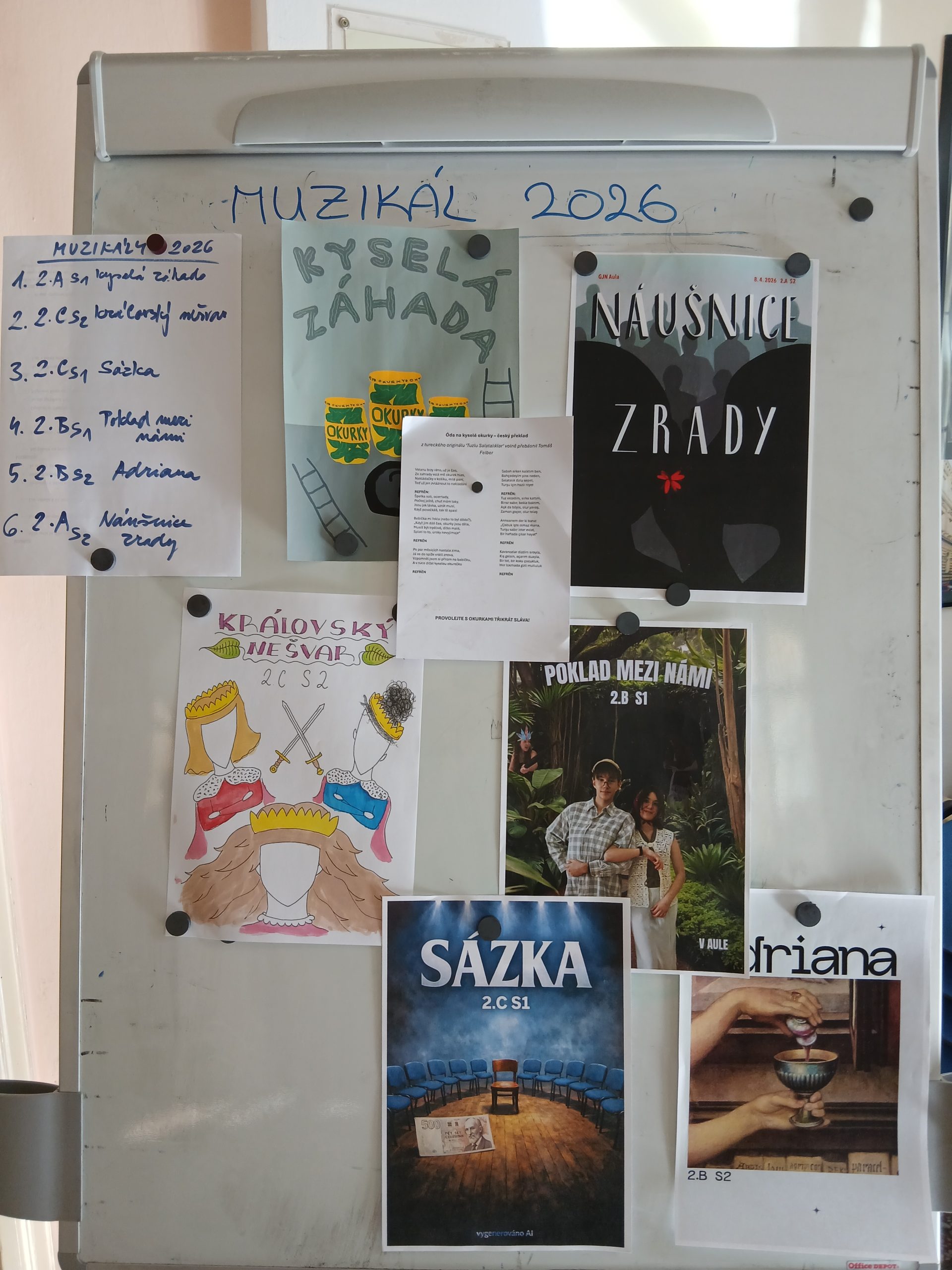 „Muzikálové klání“, které je již léta součástí vzdělávacího programu pro 2.ročníky, se letos uskutečnilo 8. dubna 2026. Studenti 2.A, 2.B a 2.C mají za úkol vytvořit vlastní muzikál, takže společně zapojují svou nápaditost, tvořivost, schopnost vymyslet příběh se zápletkou, pracují na svých pěveckých výkonech, hudebním doprovodu, společné choreografii, neotřelých kostýmech, vyrábějí rekvizity, komponují hudbu a vyrábějí plakáty.